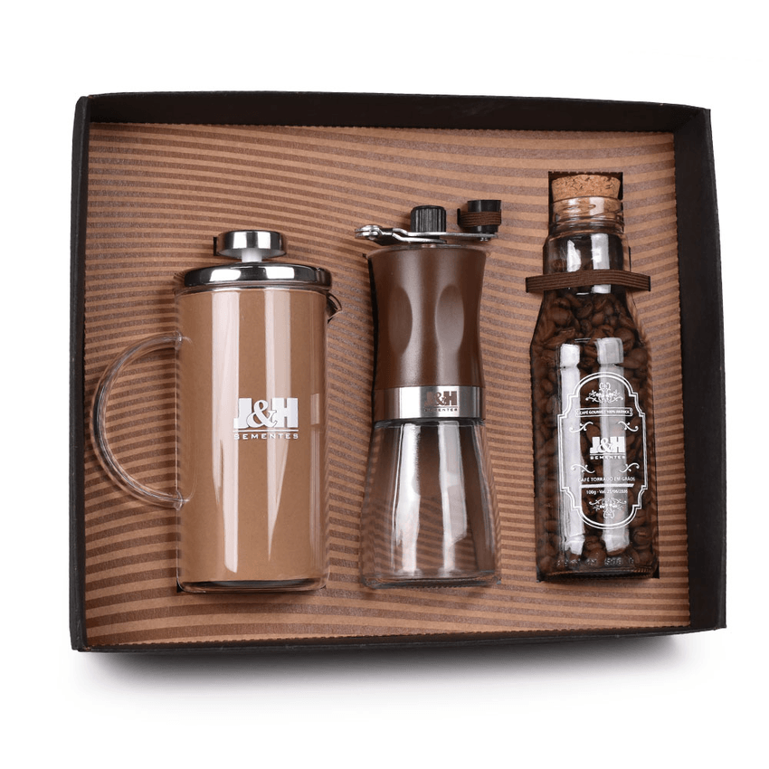 Eleve a sua estratégia de brindes corporativos com o Kit Café Gourmet Personalizado, um presente sofisticado que convida à apreciação e ao bom gosto. Este conjunto exclusivo, composto por uma elegante prensa francesa, um moedor manual e café em grãos de alta qualidade, é a escolha ideal para empresas que desejam oferecer uma experiência memorável e de valor.